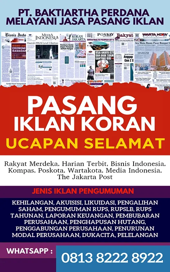 PT Baktiartha Perdana, Perusahaan Advertising, Agency resmi dan Terpercaya Pasang Iklan KORAN, PENGUMUMAN, KEHILANGAN, AKUISISI, LIKUIDASI, PENGALIHAN SAHAM, PENGUMUMAN RUPS, RUPSLB, RUPS TAHUNAN, LAPORAN KEUANGAN, PEMBUBARAN PERUSAHAAN, PENGHAPUSAN HUTANG, PENGGABUNGAN PERUSAHAAN, PENURUNAN MODAL PERUSAHAAN, DUKACITA, PELELANGAN, di Koran Jakarta, Koran Rakyat Merdeka, Harian Terbit, Bisnis Indonesia, Kompas, Poskota, Wartakota, Media Indonesia, The Jakarta Post, Rakyat Merdeka dan Koran Seluruh Indonesia