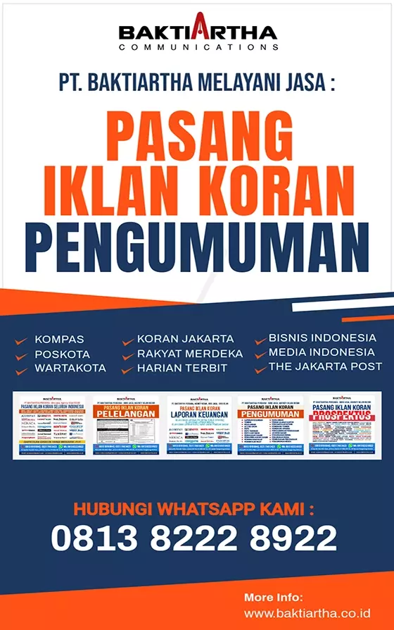 PT Baktiartha Perdana, Perusahaan Advertising, Agency resmi dan Terpercaya Pasang Iklan KORAN PENGUMUMAN di Koran Jakarta, Koran Rakyat Merdeka, Harian Terbit, Bisnis Indonesia, Kompas, Poskota, Wartakota, Media Indonesia, The Jakarta Post, Rakyat Merdeka dan Koran Seluruh Indonesia