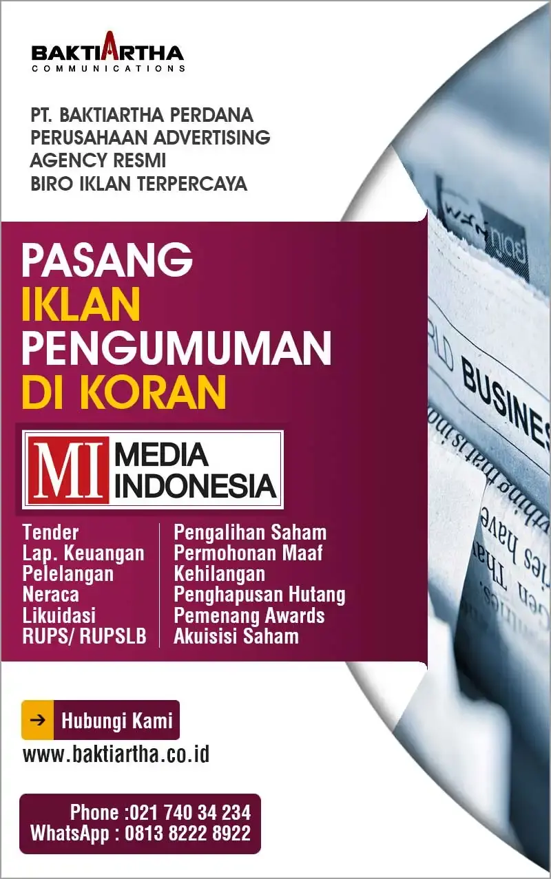 PT Baktiartha Perdana "adalah Perusahaan Advertising yang Spesialis melayani Jasa Pasang Iklan Koran Pangumuman di Koran Media Indonesia.