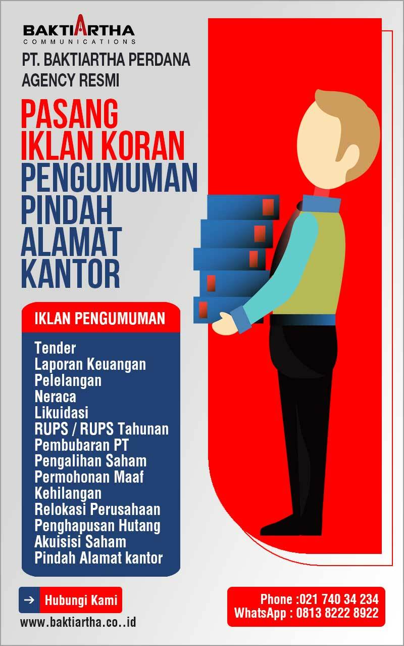 PT Baktiartha Perdana, Perusahaan Advertising, Agency resmi dan Terpercaya Pasang Iklan KORAN, PENGUMUMAN, KEHILANGAN, AKUISISI, LIKUIDASI, PENGALIHAN SAHAM, PENGUMUMAN RUPS, RUPSLB, RUPS TAHUNAN, LAPORAN KEUANGAN, PEMBUBARAN PERUSAHAAN, PENGHAPUSAN HUTANG, PENGGABUNGAN PERUSAHAAN, PENURUNAN MODAL PERUSAHAAN, DUKACITA, PELELANGAN, di Koran Jakarta, Koran Rakyat Merdeka, Harian Terbit, Bisnis Indonesia, Kompas, Poskota, Wartakota, Media Indonesia, The Jakarta Post, Rakyat Merdeka dan Koran Seluruh Indonesia